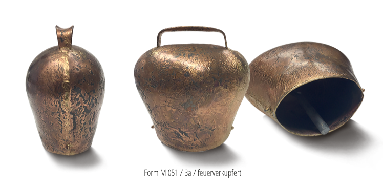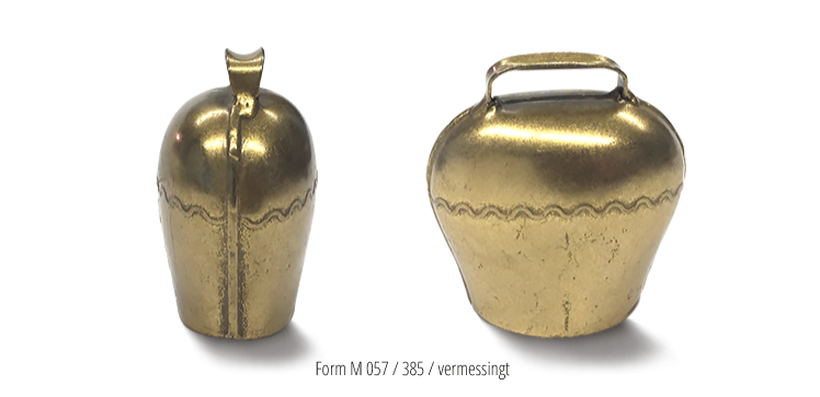 Hierbei handelt es sich um Schellen aus Stahlblech. Die Herstellung erfolgt durch drücken und anschließendem zusammenschweißen zweier Hälften, was die Form recht rund wirken läßt. Die Öffnung nach unten sieht dabei aus wie ein Mund. Der breite Bügel ist charakteristisch für viele Tier- und Herdenglocken. Es gibt sie in vermessingt, antik-messing, antik-kupfer, farbig beschichtet und roh (Stahl). Es gibt sie in der Grösse 5 bis 10cm (in der Höhe gemessen ohne Bügel). Form M 051 nur auf Anfrage (keine Lagerware).